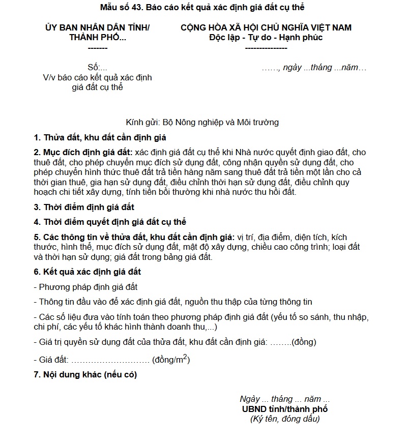 Bước 12. Trong thời gian không quá 15 ngày kể từ ngày Chủ tịch UBND cấp có thẩm quyền quyết định giá đất cụ thể, cơ quan có chức năng quản lý đất đai gửi kết quả xác định giá đất cụ thể về Bộ Nông nghiệp và Môi trường theo Mẫu số 43 ban hành kèm theo Nghị định số 151/2025/NĐ-CP.